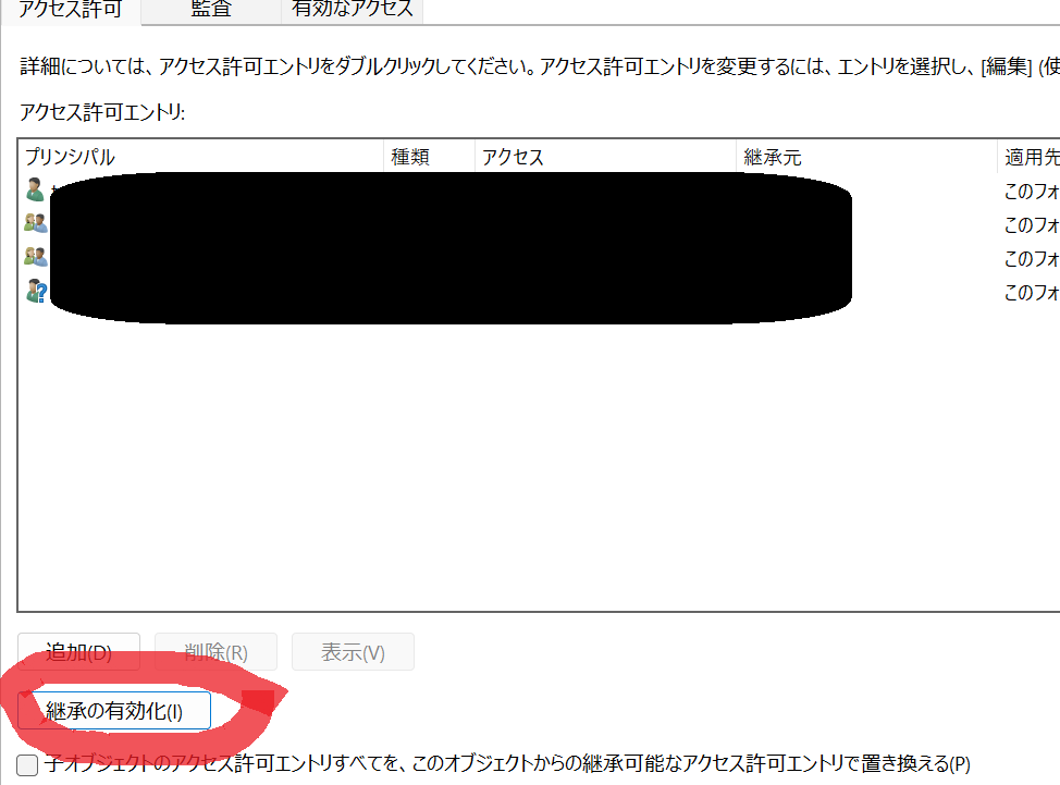 • 「詳細設定」ウィンドウの下部にある「継承の有効化」ボタンをクリックします(もし無効化されている場合)。